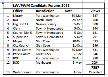 In 2021, our Voter Services team planned 13 forums to give voters a chance to ask questions of candidates and compare their answers. A dozen forums allowed almost 7,000 voters to listen and watch 46 candidates for almost 135,000 minutes. Our Port Washington-Manhasset team takes seriously the League mission of “Making Democracy Work,” by offering candidates events known for being civil, fair-minded and nonpartisan — while offering voters the chance to listen and make informed choices.