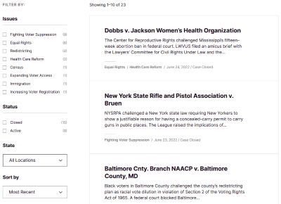 The League of Women Voters invites visitors to explore the new Legal Center and review the important historic and active cases on our docket. Learn more about the League’s Legal Center and view a user-friendly tutorial here.